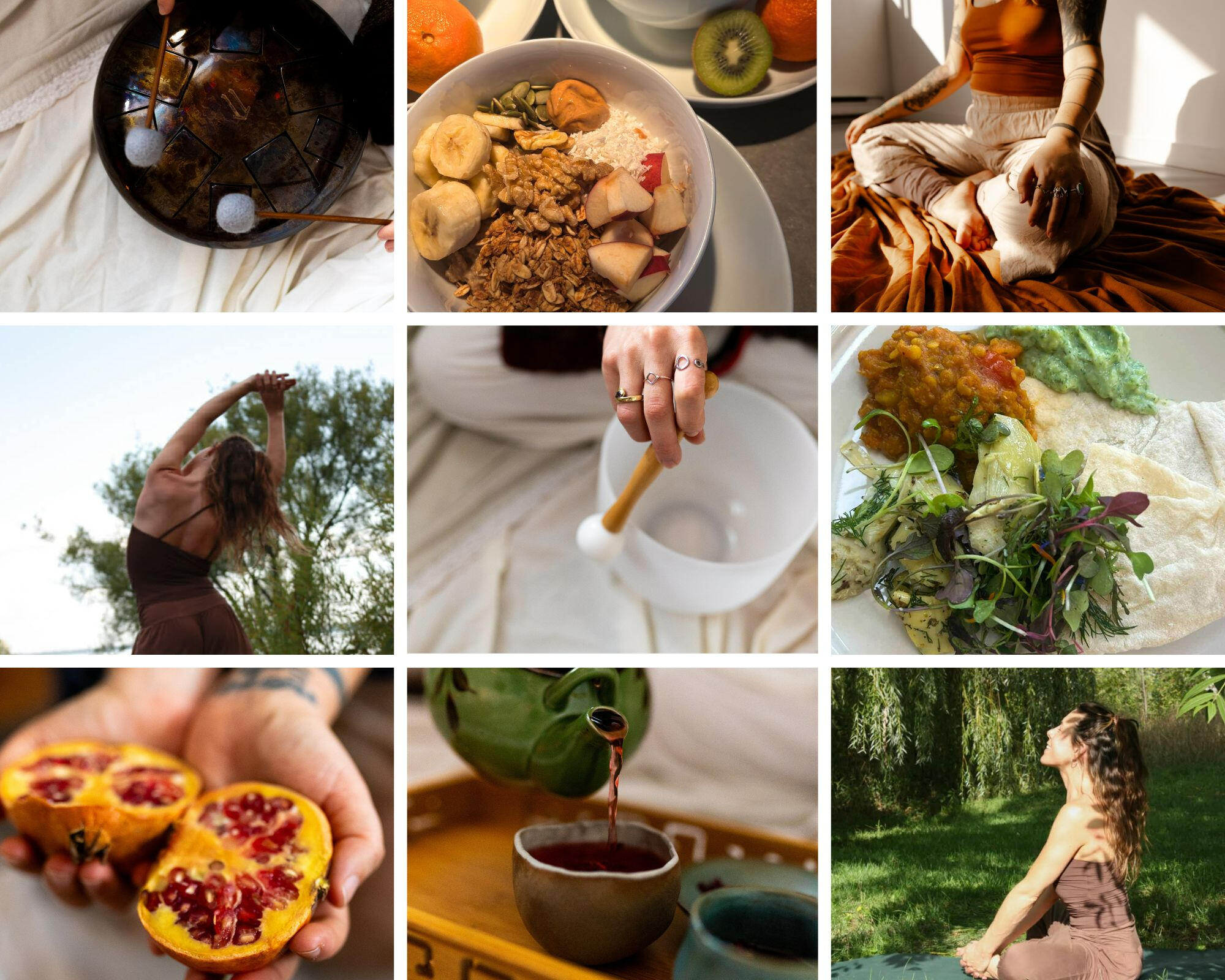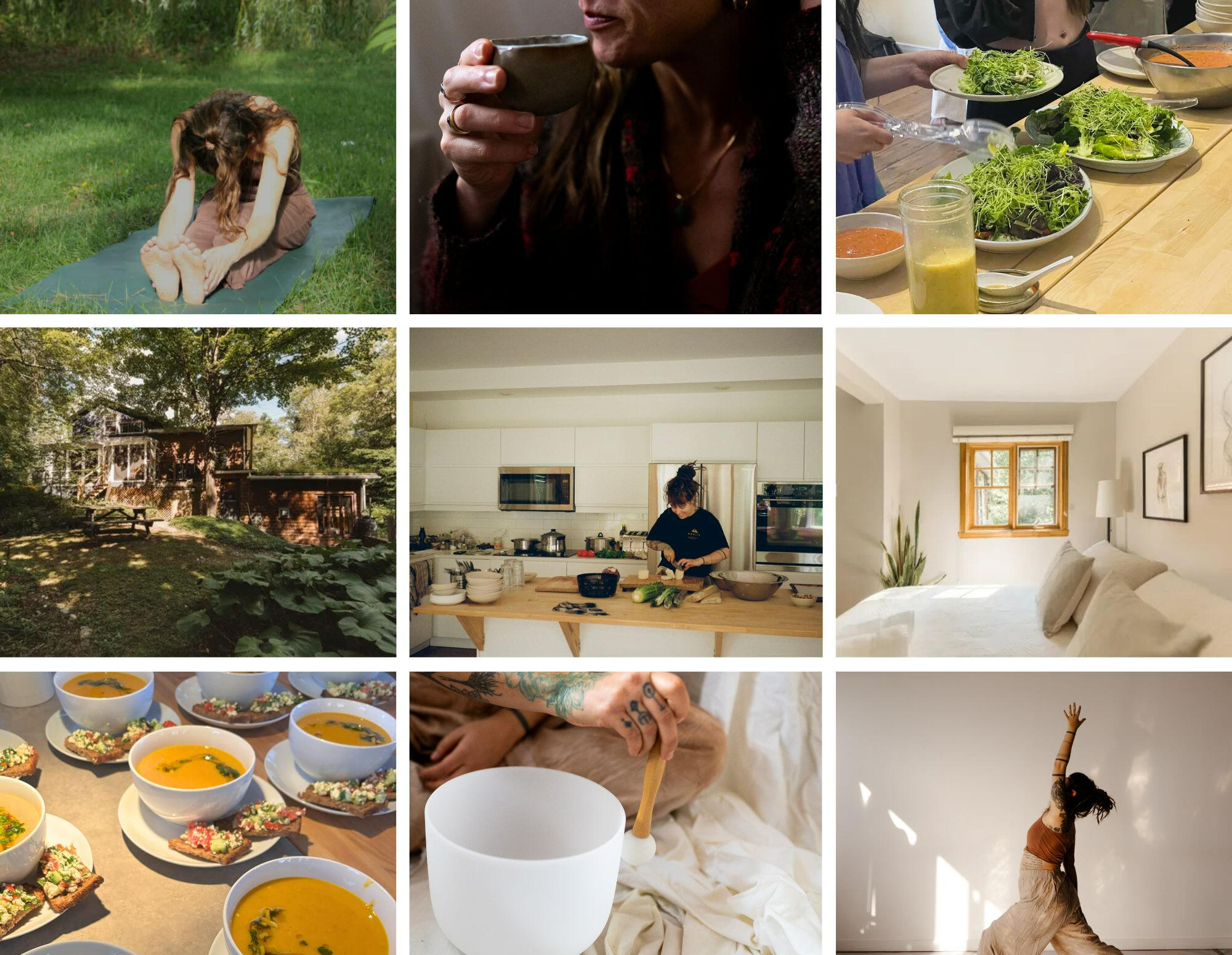 • 5 home cooked meals inspired by nature• Homemade tea blends, aromatic coffee, desserts & healthy snacks• 3 yoga classes• Sound bath healing ceremony• Mindfulness walk• Artistic workshop and exploration• Guided journaling workshop on self-development• Breathwork & meditation& more!